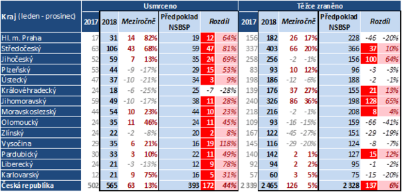 Meziročně nejvíce usmrcených osob bylo evidováno ve Středočeském kraji (+ 43), který se se 106 usmrcenými vrátil na totožnou bilanci jako v roce 2016. Druhý nejvyšší meziroční nárůst (+ 14 osob) byl evidován (zejména kvůli tragické bilanci chodců) v hl. m. Praze. Nejvyšší meziroční nárůst v oblasti těžce zraněných byl pak evidován v Jihomoravském kraji, kde došlo k 36% nárůstu. Detailní informace jsou obsahem tabulky níže.