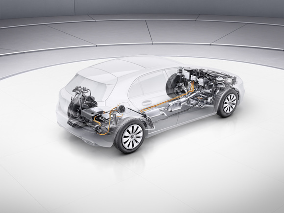 K mimořádně výhodnému uspořádání přispívá inovativní výfuková soustava. Ta není vedena až na konec vozidla, nýbrž ústí uprostřed pod podlahou. Koncový tlumič výfukové soustavy je umístěn ve středovém tunelu. Umístění palivové nádrže v prostoru nápravy vytvořilo pod zadními sedadly místo pro vysokonapěťovou sadu akumulátorů. Modely A 250 e a B 250 e mají díky tomu jen nepatrně menší objem zavazadlového prostoru v porovnání s nehybridními verzemi.