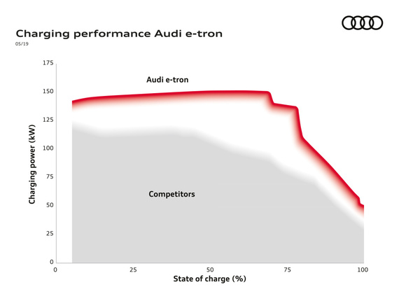Průběh nabíjení výkonem 150 kW se u modelu Audi e-tron vyznačuje kontinuitou na vysoké úrovni. Automobil je za ideálních podmínek v rozsahu stavu nabití od 5 do 70 procent nabíjen na hranici maximálního výkonu. Poté inteligentní řízení akumulátorů sníží nabíjecí proudy z důvodu ochrany lithium-iontových článků a zajištění jejich dlouhé životnosti. To je velký rozdíl od ostatních konceptů, které dosahují maximálního výkonu většinou jen po krátkou dobu a již před dosažením hranice nabití na 70 procent nabíjecí výkon výrazně snižují. Audi e-tron totiž ještě při stavu nabití 80 procent používá nabíjecí výkon více než 100 kW.