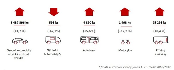 Po započtení produkce přípojných vozidel k počtu motorových vozidel je celkový počet silničních vozidel vyrobených v roce 2018 v ČR, rekordních 1 469 675 kusů, což je meziroční nárůst 1,6 %.