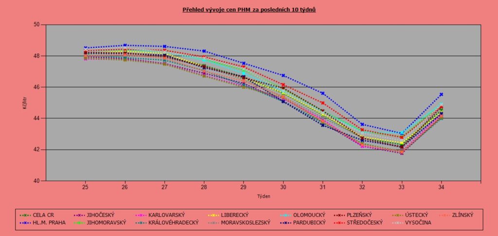 Nejlevněji vychází nafta v Královéhradeckém kraji (44,00 Kč/l) a vyplatí se přibrzdit také v kraji Ústeckém (44,05 Kč/l). Nejvyšší ceny zůstávají opět v Praze (45,54 Kč/l) a Olomouckém kraji (44,92 Kč/l).