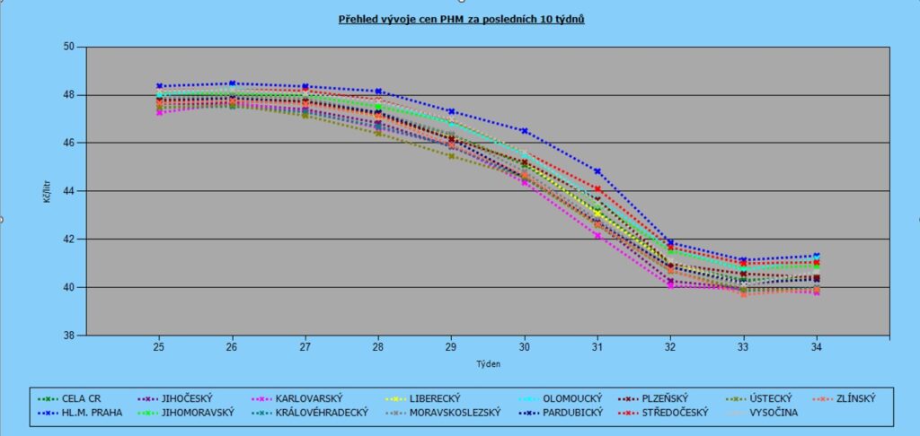 Natural 95 natankují řidiči nejlevněji v Karlovarském (39,74 Kč/l) a Ústeckém kraji (39,89 Kč/l). Naopak nejvíce zaplatí v Praze (41,32 Kč/l) a na Olomouckém kraji (41,21 Kč/l).
