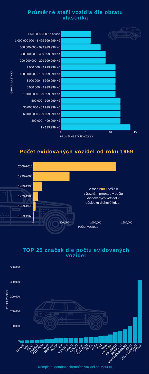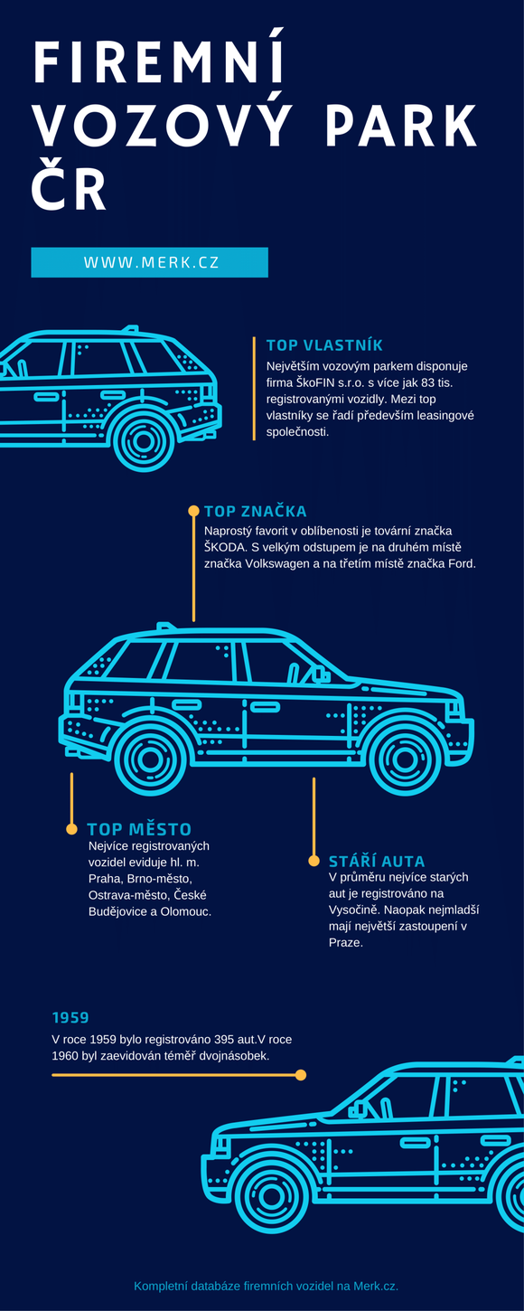 V České republice bylo během uplynulých padesáti let zaregistrováno přes 2 miliony firemních automobilů. Kromě krizového roku 2009 jejich počet neustále roste. Jen v loňském roce přibylo do firemních vozových parků více než 200 tisíc vozidel. Nejmladšími vozidly disponují firmy s obratem nad 200 milionů, přičemž nejčastěji volí značku Škoda. Vyplývá to z nejnovějších údajů společnosti Imper CZ, která je lídrem v práci s otevřenými daty a jejich interpretací.