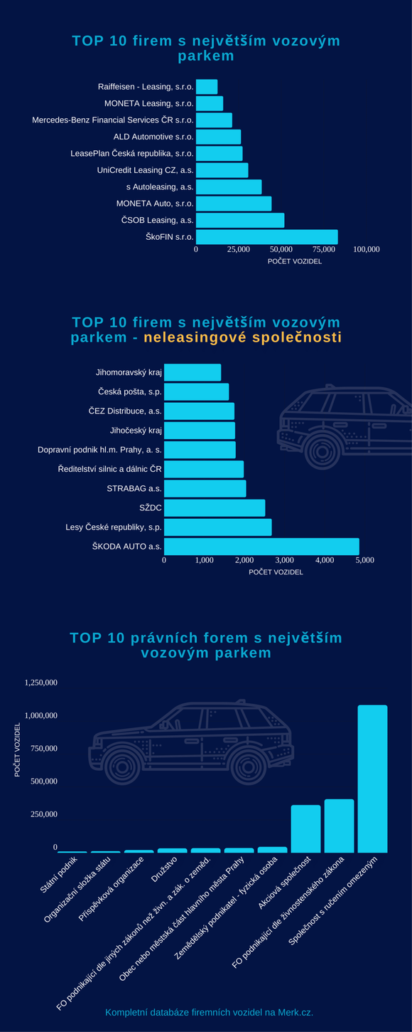 Nejvíce firemních vozidel v České republice vlastní společnosti s ručením omezeným. Celkově se jedná o více než 50 % registrovaných vozidel. Podnikající fyzické osoby vlastní 19 % vozidel a akciové společnosti 17 % vozidel. Subjekt Kraj a hl. m. Praha disponuje přes 6,5 tisíci vozidly, obce a městské části Prahy vlastní více než 34 tisíc vozidel. Počet firemních aut stále roste, výjimku tvořil pouze rok 2009, kdy bylo kvůli ekonomické krizi v eurozóně zaevidováno o 19 % méně vozidel.