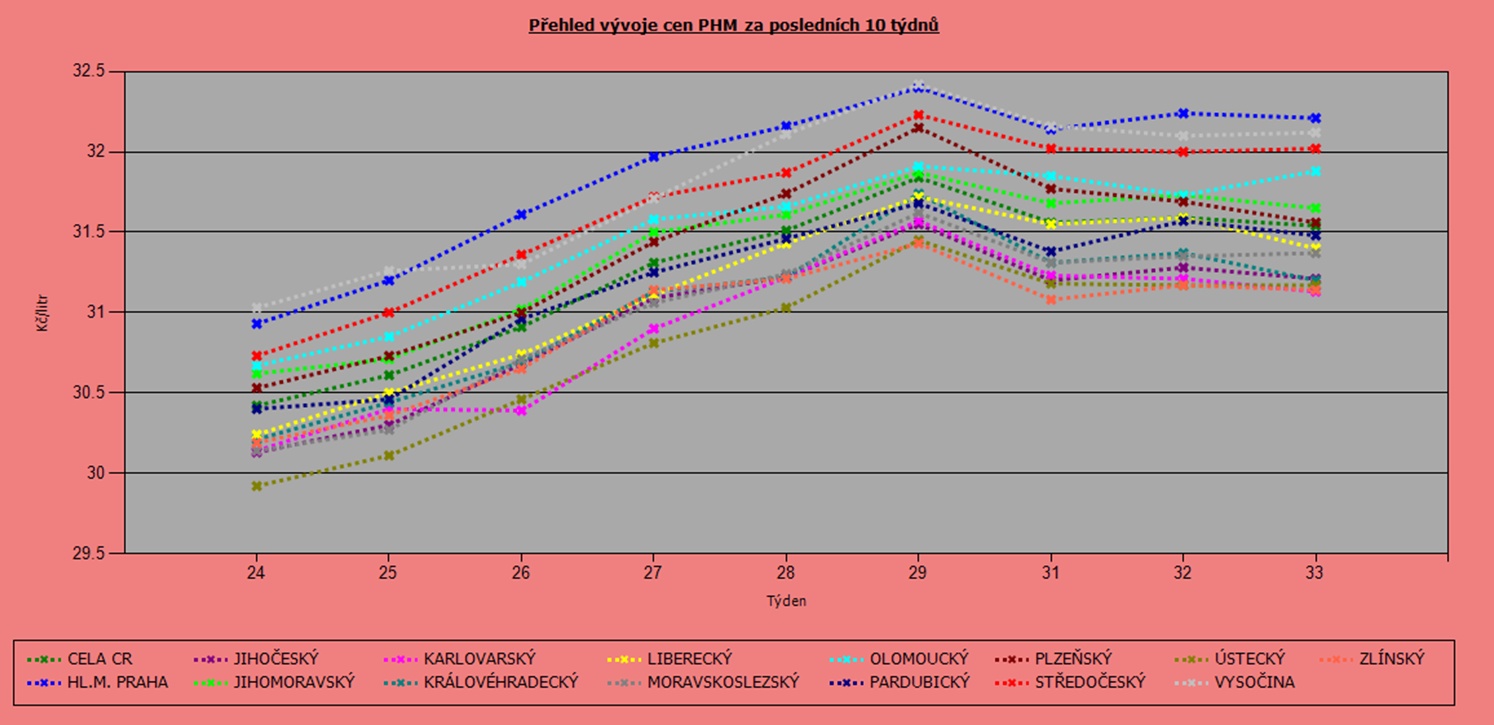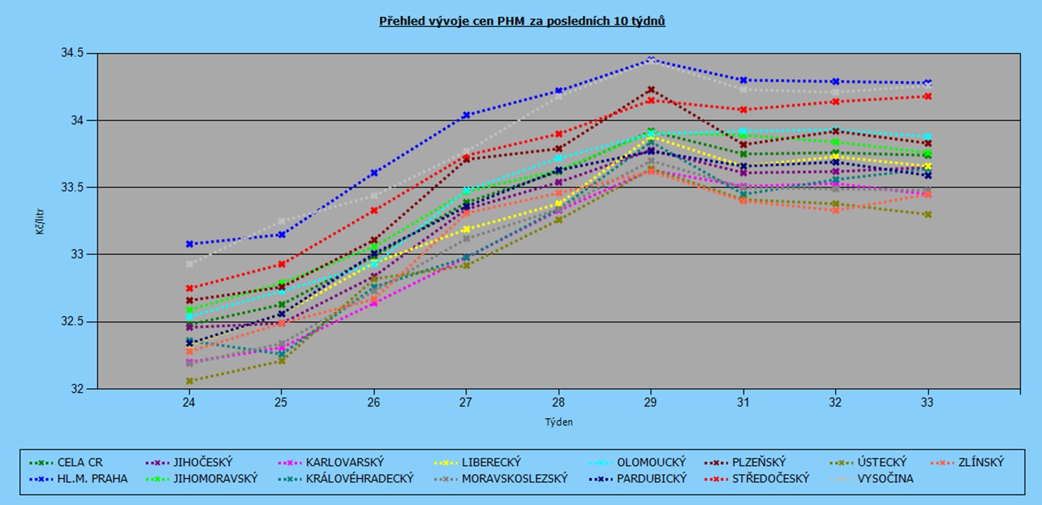 Aktuálně řidiči tankují Natural 95 v průměru za 33,74 Kč/l. Nejdražšími kraji jsou Praha (34,28 Kč/l) a Vysočina (34,23 Kč/l). Naopak nejlevněji doplníme nádrže v Ústeckém (33,30 Kč/l) a Karlovarském kraji (33,45 Kč/l).