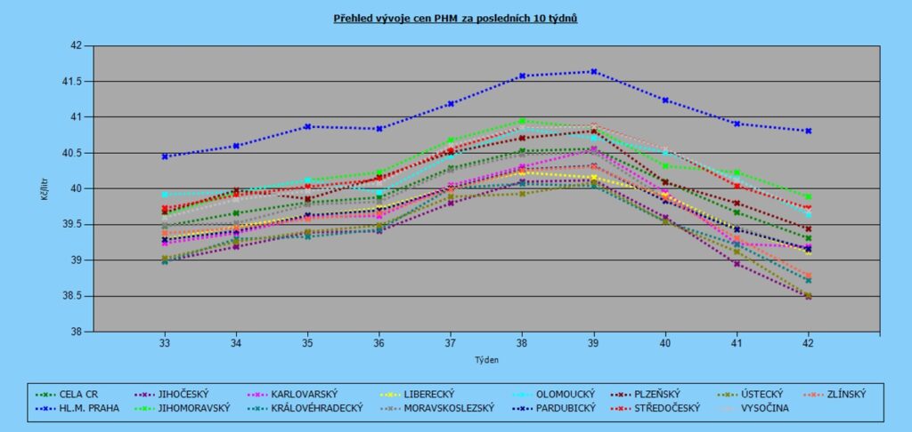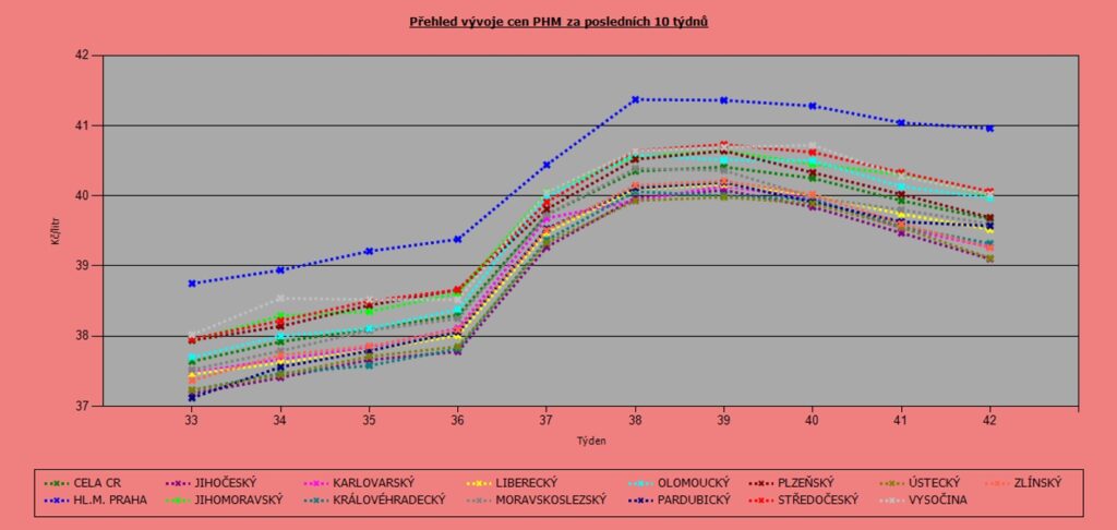 U nafty jsou rozdíly ještě větší. V Praze vyjde litr v průměru na 40,96 Kč/l, zatímco ve Středočeském kraji na 40,06 Kč/l. Výrazně levněji je ale v Jihočeském (39,10 Kč/l) a Zlínském kraji (39,26 Kč/l)