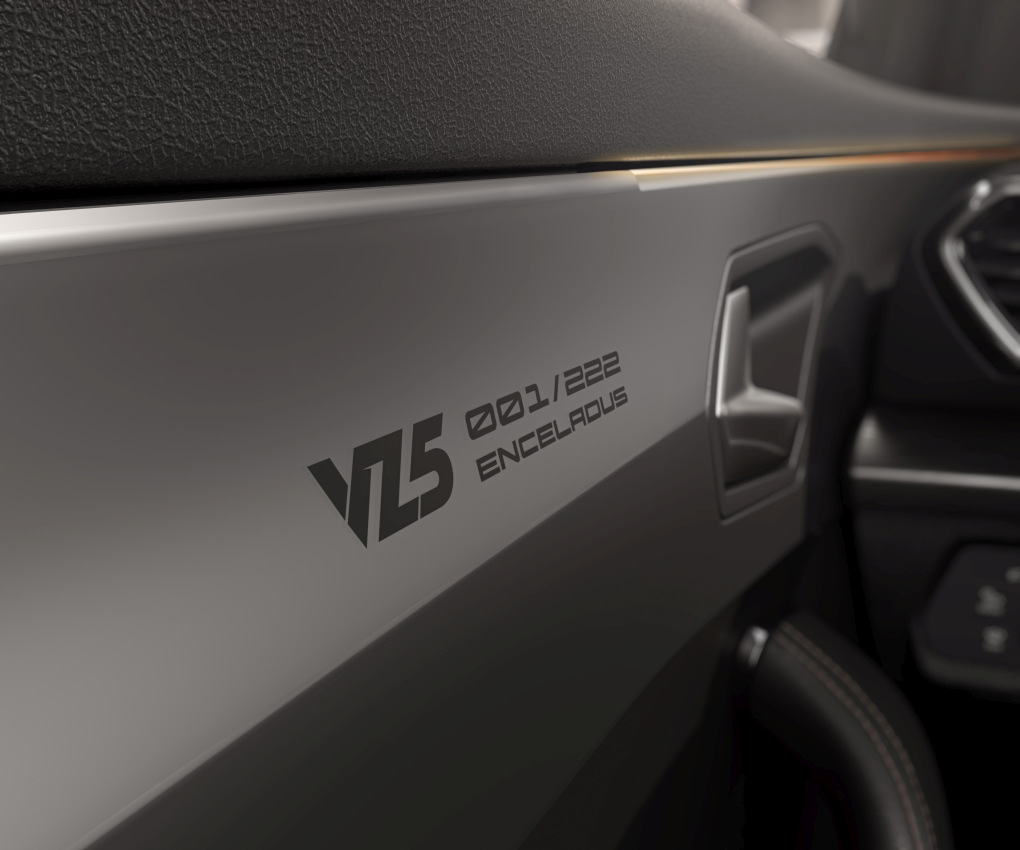 Podobně obdržela limitovaná edice CUPRA Formentor VZ5 Enceladus Grey tmavě chromované nápisy CUPRA, loga a ozdobné prvky v interiéru, kryty vnějších zpětných zrcátek z černého uhlíkového kompozitu a koncovky výfukové soustavy v černém provedení a černá 20“ kola z lehké slitiny (na přání v barvě mědi). Interiér této edice rovněž profituje z černých skořepinových sedadel CUPBucket a černé přístrojové desky s prošíváním.