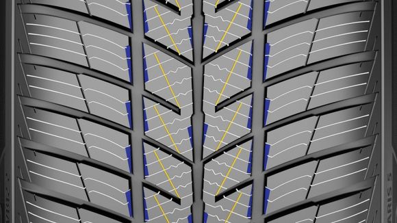 Správné chování pneumatiky na sněhu, mokru i suchu má na svědomí třídrážkový dezén s dvojicí tuhých středních bloků a s řadou inovativních trakčních zářezů, umístěných v obvodových drážkách. Adhezi na všech typech povrchů dále zvyšuje koncept multifunkčních lamel (bílé), boční vedení na sněhu zlepšuje unikátní profil střední části dezénu (vyznačen modře).