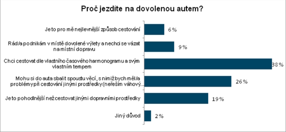 Kromě cestování autem volí 31 % Čechů letadlo, 14 % preferuje vlak a 12 % autobus. Zajímavostí je letní dovolená strávená na kole (3 %). Téměř dvě pětiny (38 %) řidičů upřednostňuje auto kvůli tomu, že chtějí cestovat dle vlastního časového harmonogramu a svým vlastním tempem. Více jak čtvrtina (26 %) Čechů shledává výhody v rozměrném zavazadlovém prostoru, kam si mohou sbalit věci, s nimiž by měli problémy při cestování s jiným dopravním prostředkem. Mezi další důvody patří pohodlí (19 %). Podnikaví autodovolenkáři zase oceňují možnost využít vůz na výlety přímo v cílové destinaci, kdy se nemusí vázat na místní dopravu (9 %).