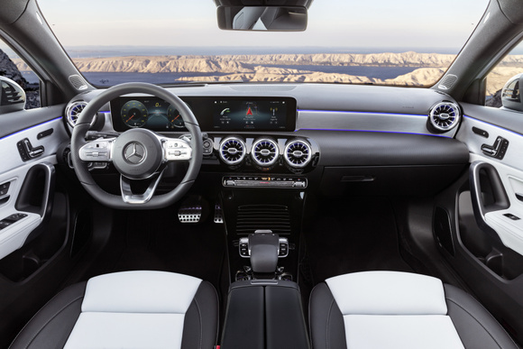 Poprvé bylo zcela upuštěno od stínítka nad panelem přístrojů, který nahradil elegantní displej s tabletovým vzhledem. Širokoúhlý displej vyčnívá volně do prostoru. Třídu A je možné mít ve třech uspořádání obrazovek. V základní konfiguraci je palubní deska osazena dvě displeji s úhlopříčkou 7“. Druhou možností je kombinace 7“ a 10,25“ a u nejvyšší výbavy je v obou případech shodná obrazovka 10,25“. Pozoruhodným prvkem jsou rovněž výdechy ventilační soustavy ve sportovním stylu vyústění turbíny.