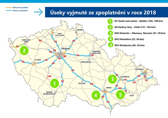 Dálniční známku nebudou řidiči od ledna potřebovat například na dálnici D3 kolem Veselí nad Lužnicí a na D6 mezi Chebem a Karlovými Vary. Bez poplatku bude také dálnice D55 kolem Otrokovic, D52 u Pohořelic nebo část D46 u Hněvotína, aby se motoristé mohli bezplatně dostat na obchvat Olomouce na dálnici D35.