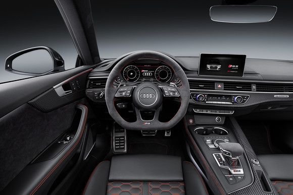 Interiér je plný kvalitních materiálů s prvotřídním dílenským zpracováním. Sportovní sedadla RS jsou čalouněná jemnou kůží Nappa, na přání mohou mít prošívání s voštinovým vzorem. Součástí je dále kůží obšitý multifunkční volant a četná loga RS zdobící sedadla, volant, prahové lišty a páku voliče. Veškeré jízdní informace jsou zobrazovány na digitálním panelu Audi virtual cockpit s vysokým rozlišením.