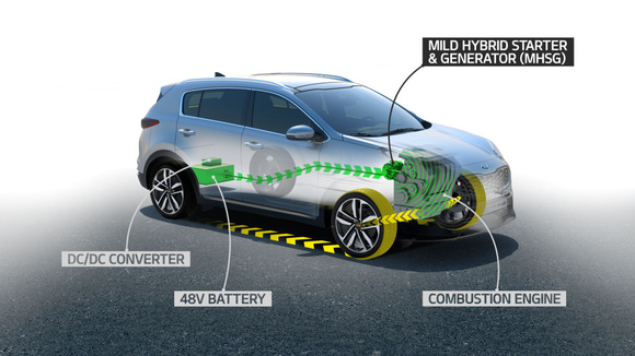 Naftová Mild-hybrid technologie EcoDynamics+ s režimy "elektromotor" a "generátor" Částečně hybridní technologie Kia využívá kompaktní Li-Ion baterii 48 V o kapacitě 0,46 kWh a nový mHEV startér/generátor MHSG (Mild-Hybrid Starter-Generator). Jednotka MHSG je elektronicky řízena a hladce se přepíná mezi dvěma režimy: elektromotoru a generátoru. Jednotka MHSG je prostřednictvím řemene spojena s klikovým hřídelem naftového motoru, kterému při akceleraci v režimu ‚elektromotoru‘ vypomáhá elektrickou posilou až 10 kW, čímž snižuje zatížení spalovacího motoru a produkované emise. V režimu ‚generátoru‘ pak systém zpětně získává z kinetické energie vozidla, během zpomalování se zařazeným rychlostním stupněm a při brzdění, elektrickou energii pro zpětné dobíjení akumulátoru.