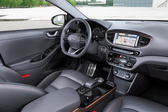 Uvnitř je ioniq typickým hyundaiem, jedinou zásadní odlišností je ovládání převodovky tlačítky, která nahrazují konvenční volič. Zajímavostí u elektromobilů málo vídanou jsou pádla pod volantem, kterými se nastavuje intenzita rekuperačního brzdění – od nulového po intenzivní, kdy v běžných jízdních situacích není v podstatě potřeba šlapat na brzdový pedál.